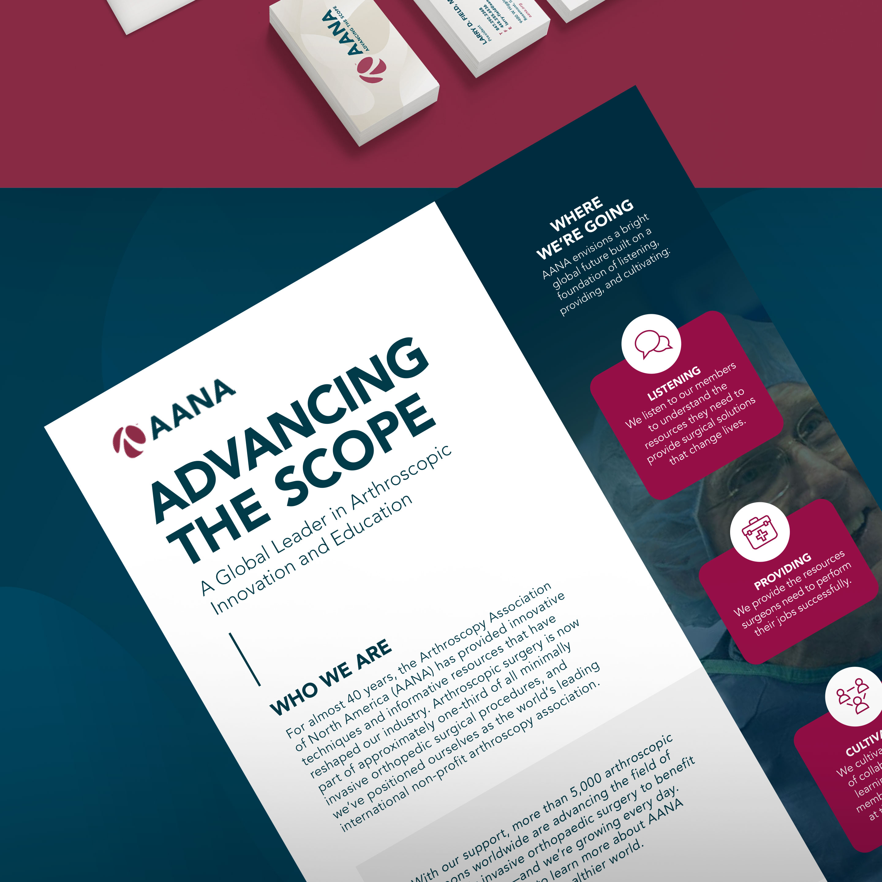 The goal of this project was to refresh Arthroscopy Association of North America® with a modern identity that allows for brand longevity as well as the future expansion into international markets. The mark was developed based on imagery of joints from the view of arthroscopic cameras, while the paired logotype mimics its organic attributes. The extension of the brand included a set of icons to be used as identifiers for each membership class as well as a generalized mark used as a way to present AANA® as a global entity.