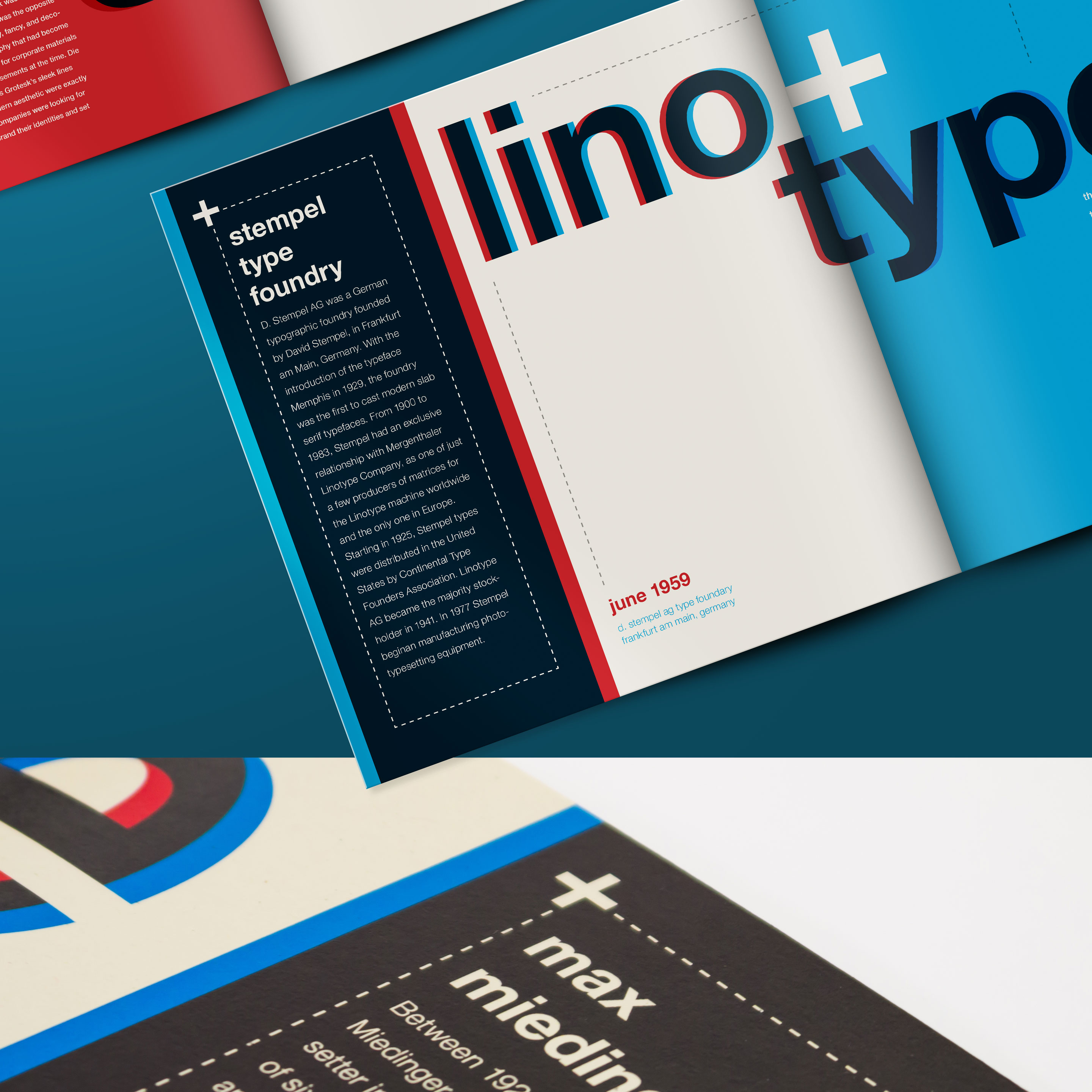 The solution was to make use of a strict grid structure and a Swiss color palette to communicate the international-style design. Large character overlays were used to emphasize the various letterform iterations that were made over time. The choice was made to print the brochure on a Speckletone French Paper®, including dashed lines throughout as a way to reference the original typeface blueprints as well as reinforce the visual grid-system used by designers during that period in history.