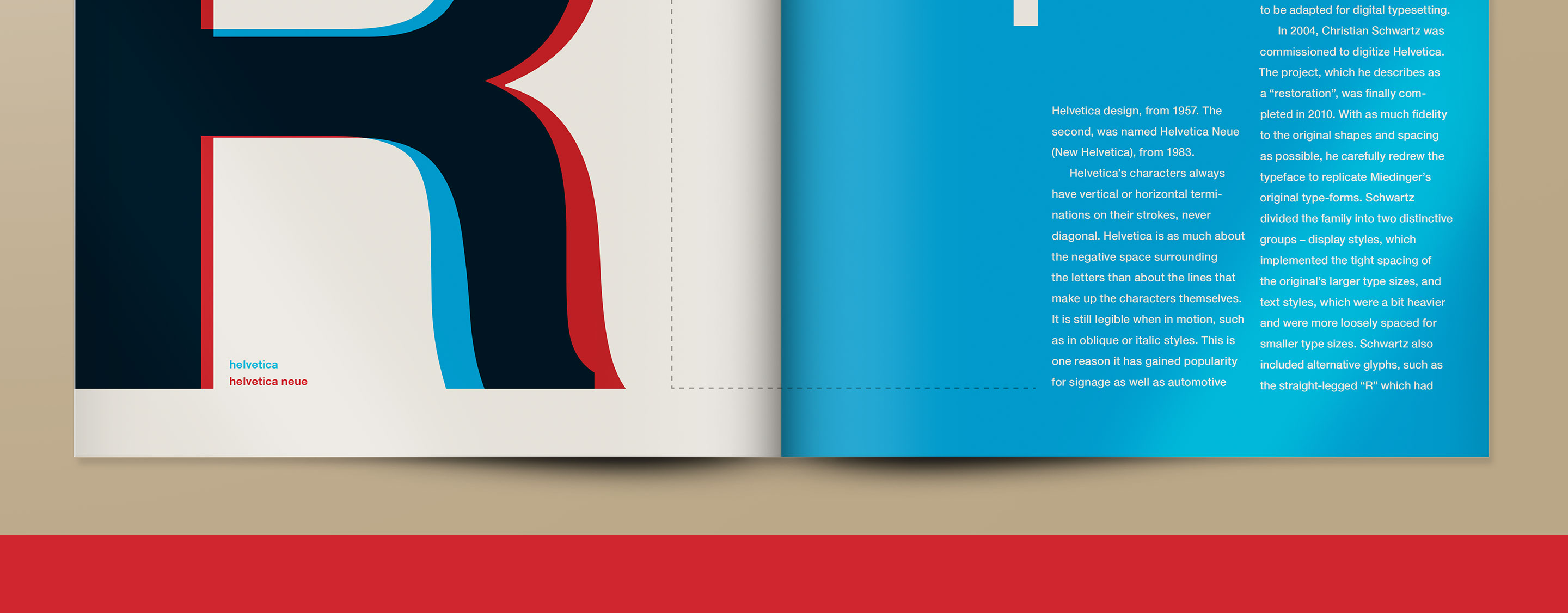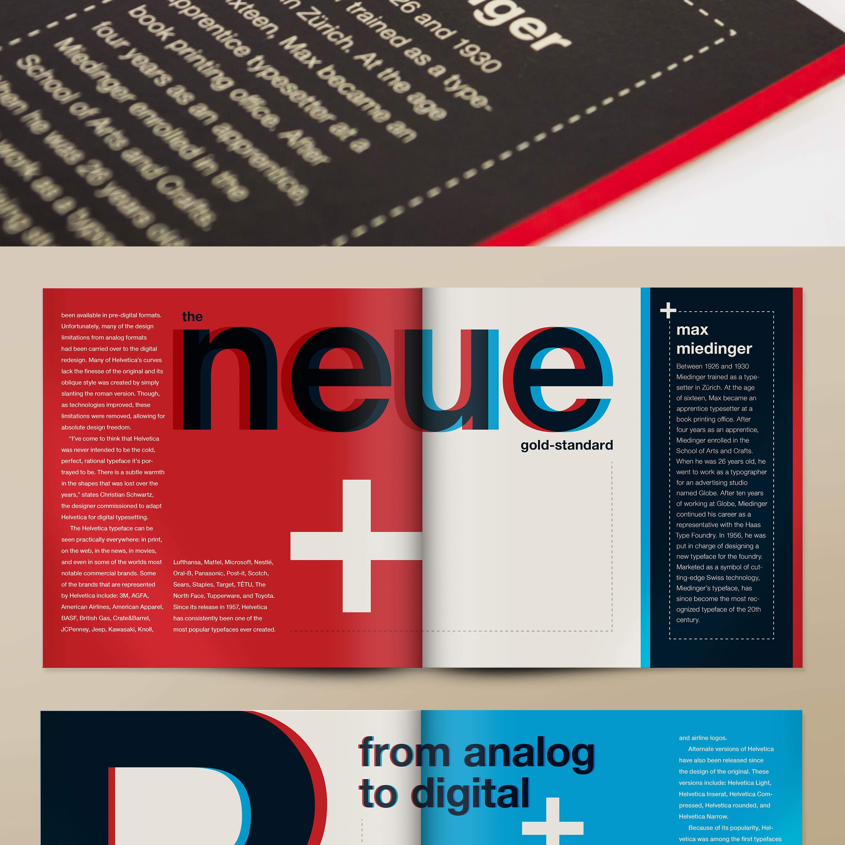 The goal of this project was to create a brochure that both exemplifies the iconic design attributes and honors the heritage of an influential typeface. With that goal in mind, I developed Helvetica, a multi-spread print brochure, incorporating classic typographic elements alongside a variety of dynamic compositions.