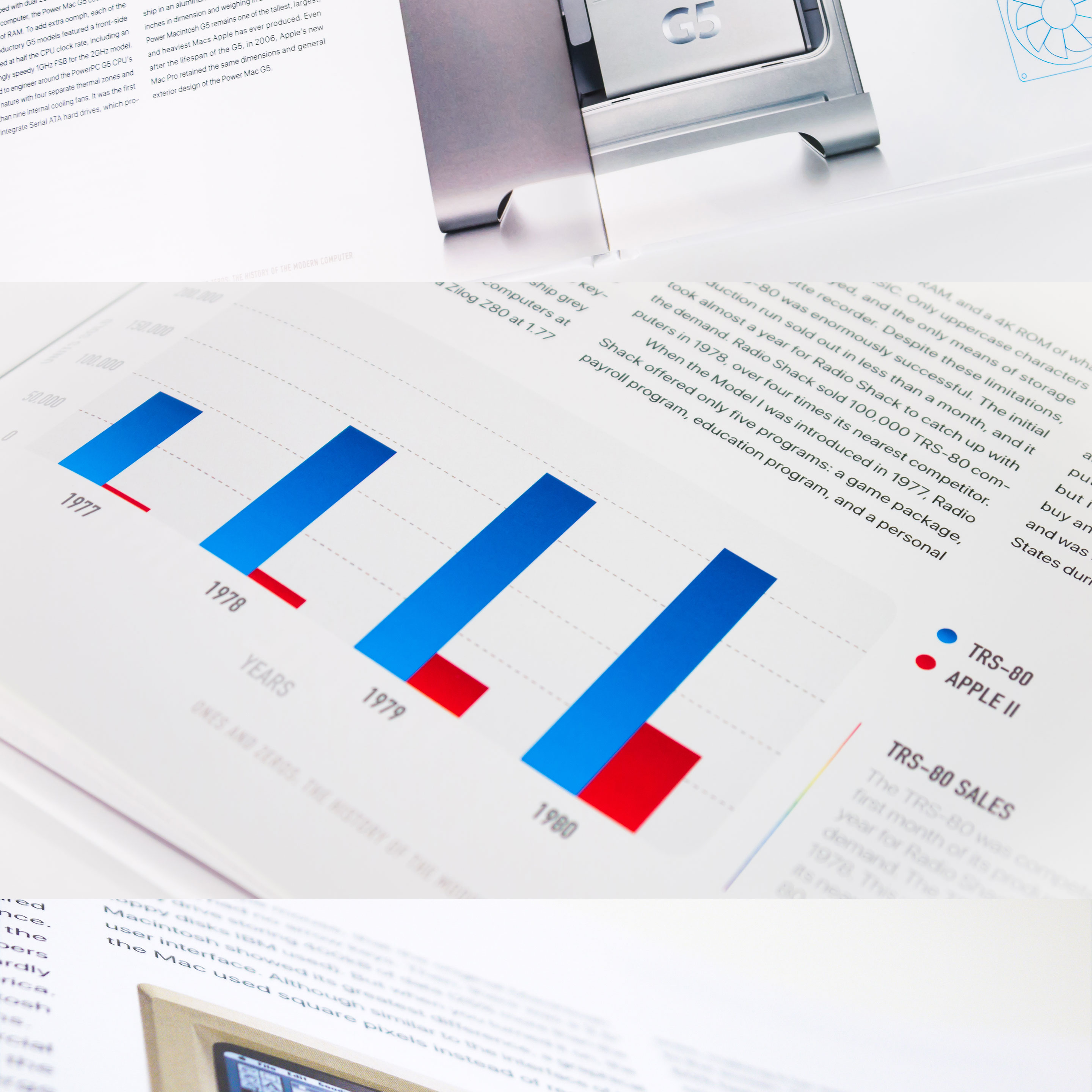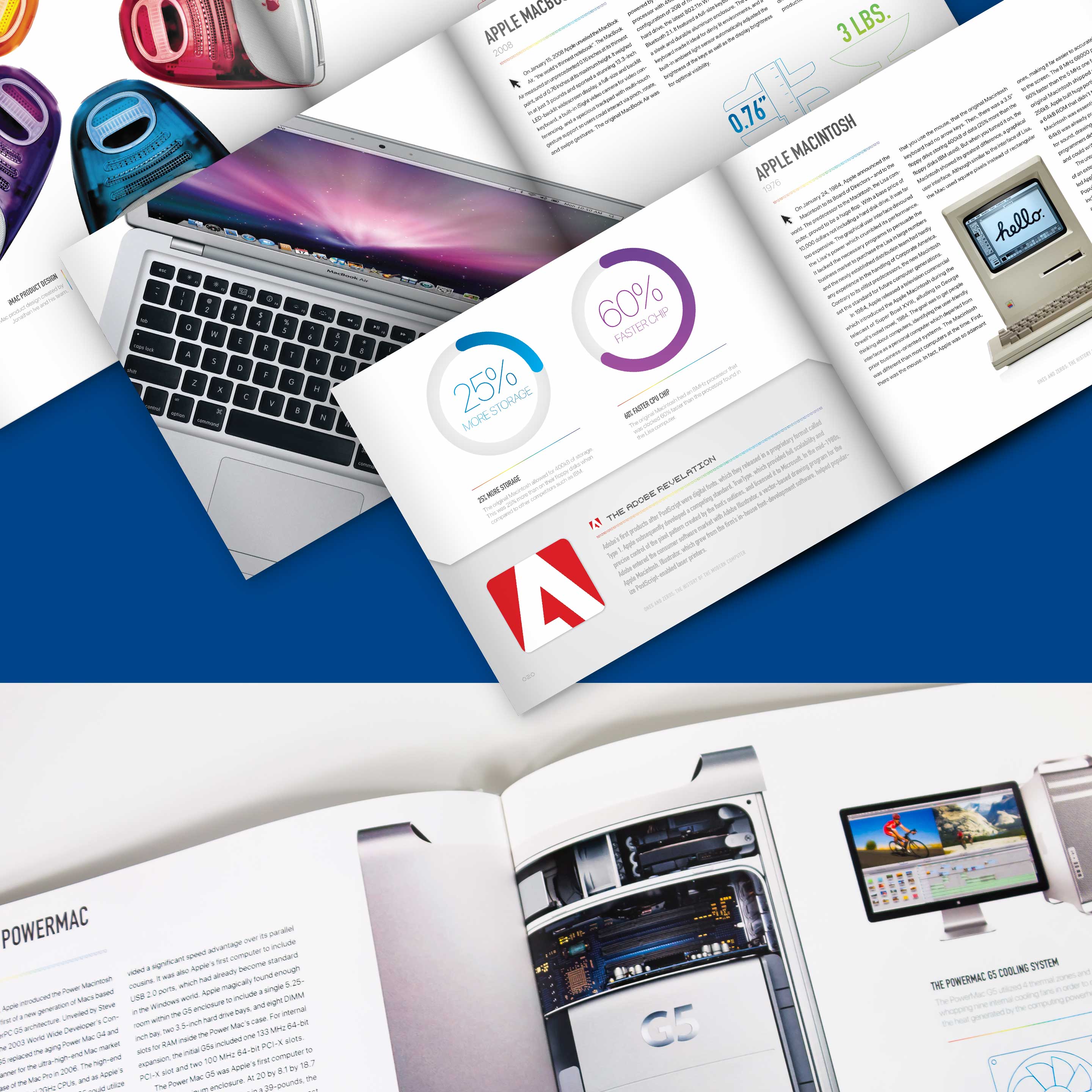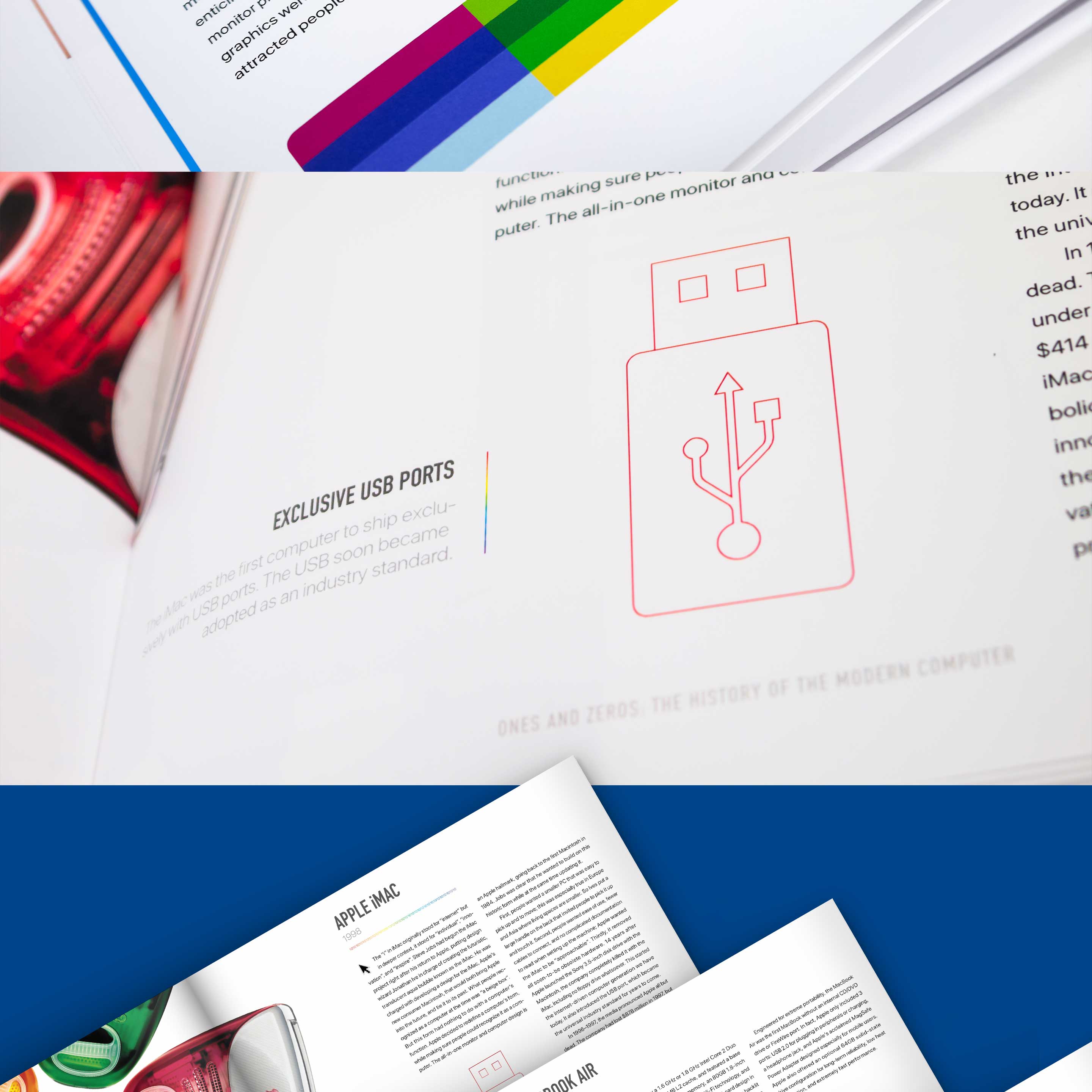 The book incorporates bitmap typography and dynamic, high-resolution photography in order to emphasize the unique form of each product. A rainbow color palette was chosen as a way to reference the color spectrum of RGB computer displays. Clean iconography of computer hardware are presented alongside detailed charts and infographics that were designed to mimic an operating system user-interface.
