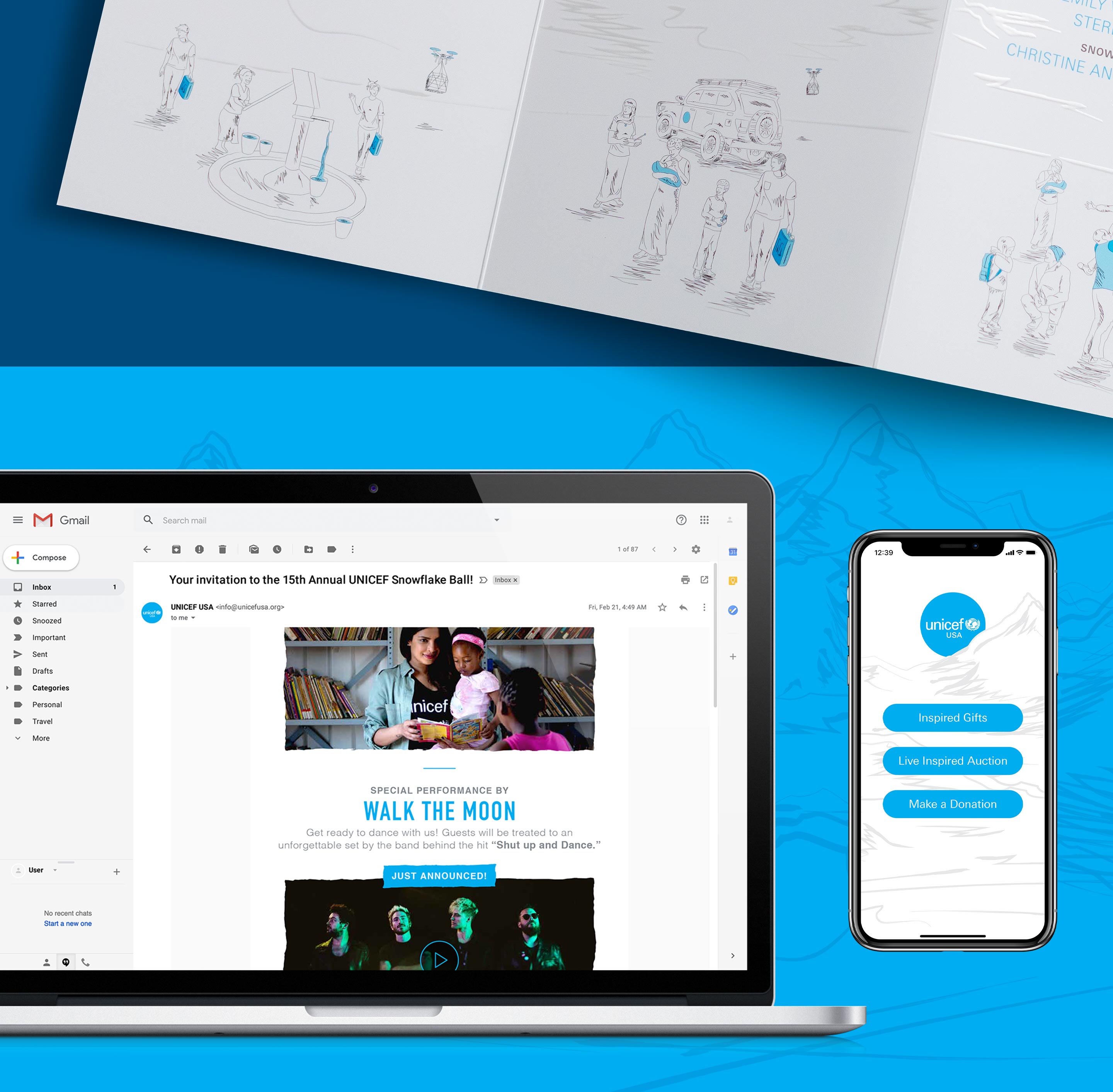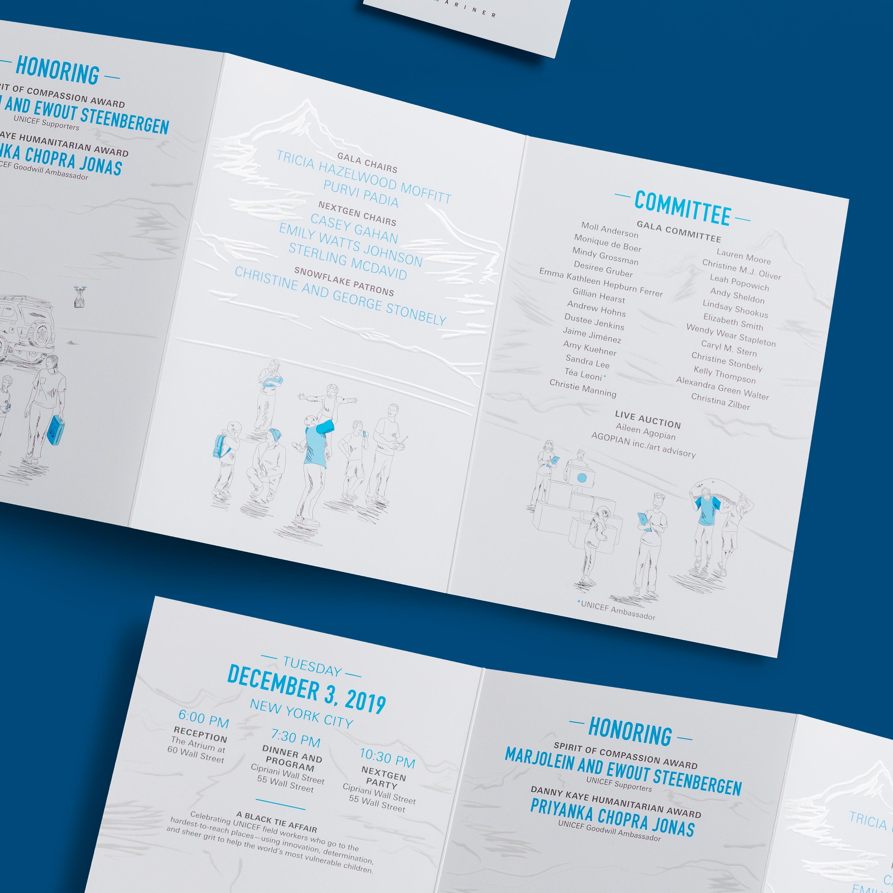 The goal of this project was to develop a visual branding system for the the 15th annual UNICEF® Snowflake Ball. This annual celebration reinforced that UNICEF® won’t stop working until every child has what they need to thrive. UNICEF's 13,000+ field workers will do whatever it takes to reach and support the world’s most vulnerable children. The event branding incorporated simplified character illustrations against minimalist landscape backgrounds. This visual system was applied a variety of pieces including both print and digital save-the-dates and invitations, a fundraising card deck, an event program booklet, and a silent auction user-interface. The inspiring evening underscored that the organization’s biggest supporters won’t stop either, raising a record-breaking, $5.1 million for children around the world.